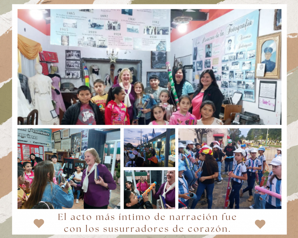 El acto más íntimo de narración fue con los susurradores de corazón. Esta actividad, que suele llevarse a las plazas, calles y escuelas para compartir poemas y relatos, tuvo en el museo un significado especial. Con los susurradores en manos los alumnos se acercaban a los visitantes para susurrarles al oído pequeños fragmentos de la historia que habían descubierto. Eran susurros sobre la importancia del patrimonio, sobre el origen de una moneda o la historia de una campana, un acto personal y mágico que invitaba a la reflexión. Con cada susurro, los chicos contaban la historia al oído de la gente, sembrando en ellos la semilla de la curiosidad y el respeto por el pasado.